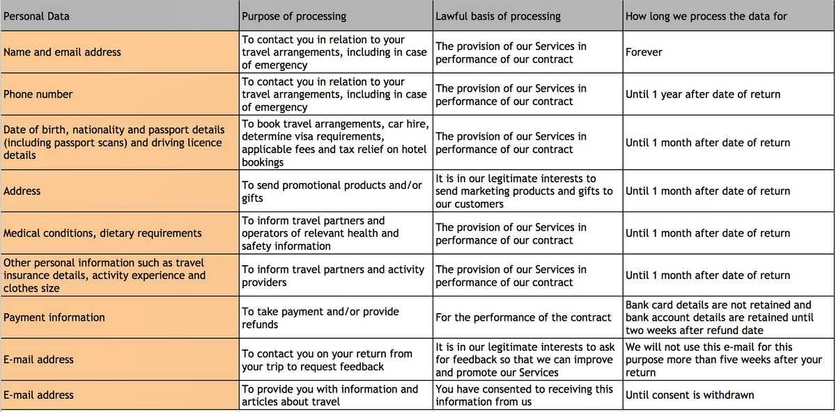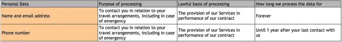 When you book your travel through Brilliant Ethiopia we collect certain personal information from you in order to be able to provide our Services to you. We set out in the table below the type of personal information we collect, the purpose for collecting it, the lawful basis for collecting it and the length of time we keep that information.